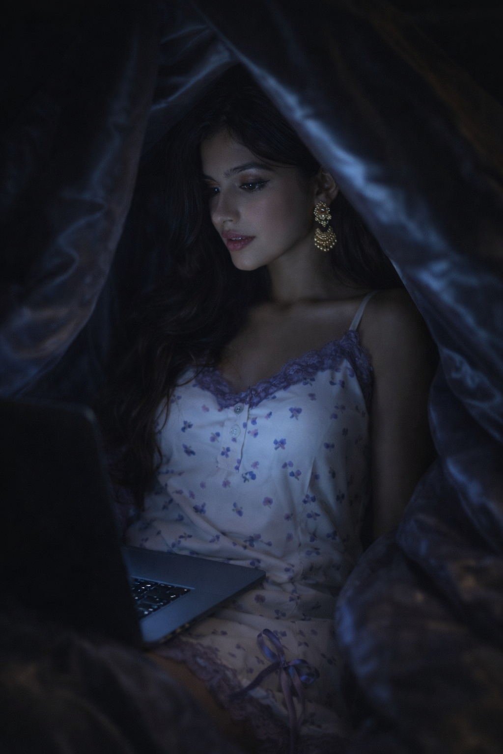 Mira ne heavy silk blanket apne sir aur shoulders par khinch li, ek chhota sa dark tent bana liya jisme sirf laptop screen ki roshni thi.
